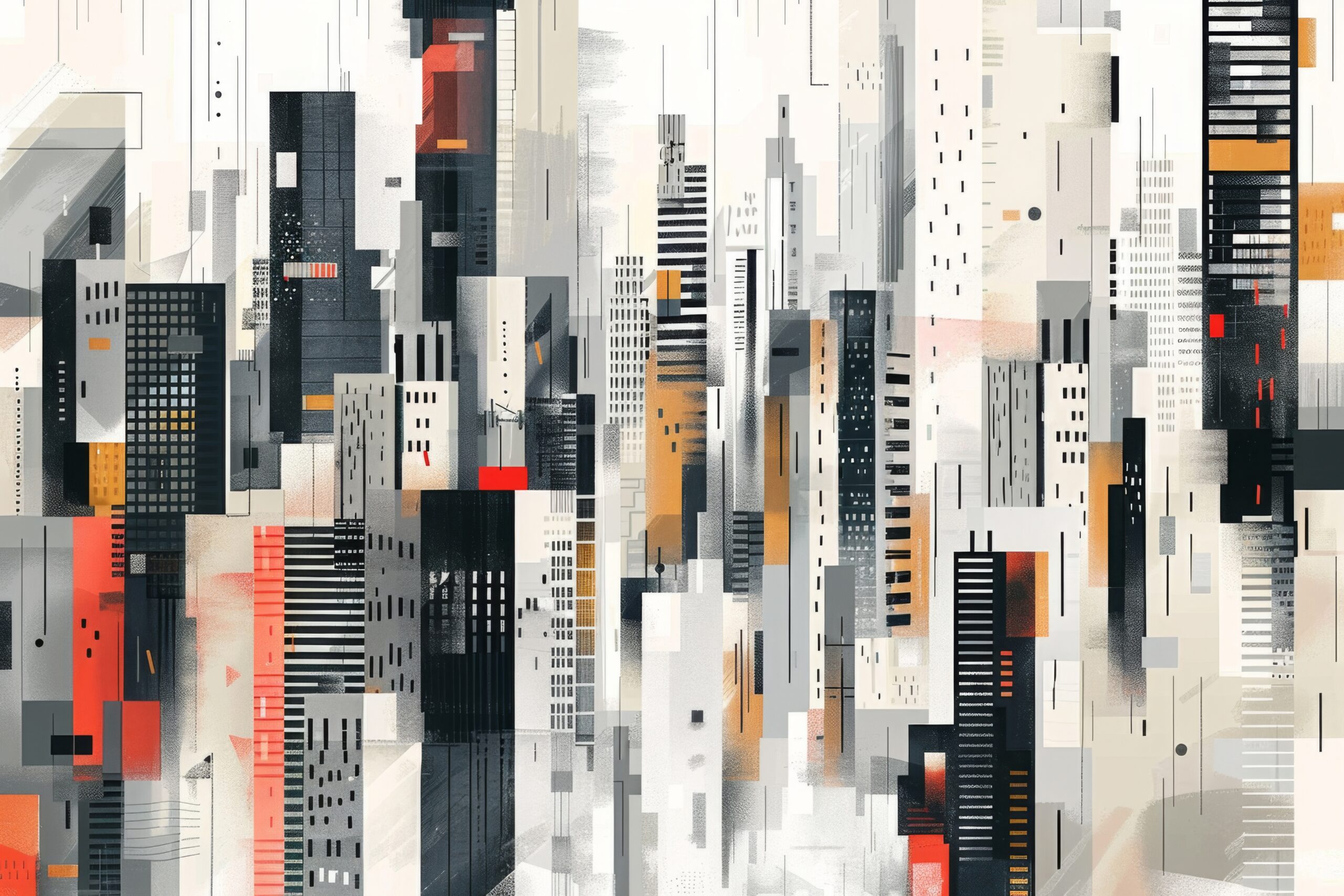 Das Bild zeigt eine stilisierte Skyline mit hohen Gebäuden in geometrischer Form. Dezente Farbakzente in Orange und Rot setzen Kontraste zu schwarz-grauen Tönen.