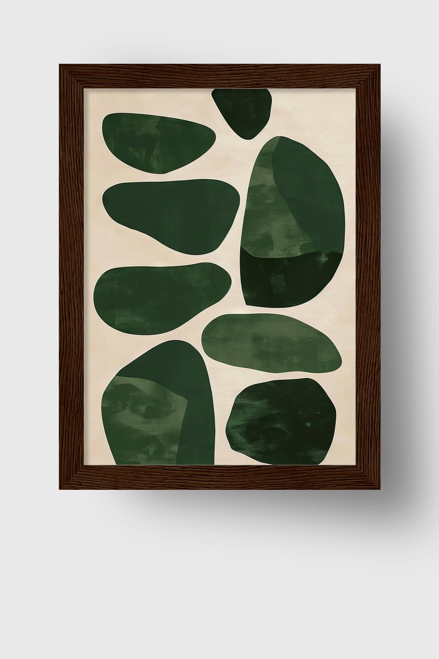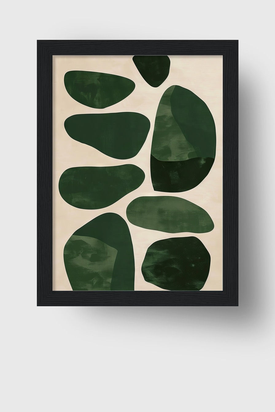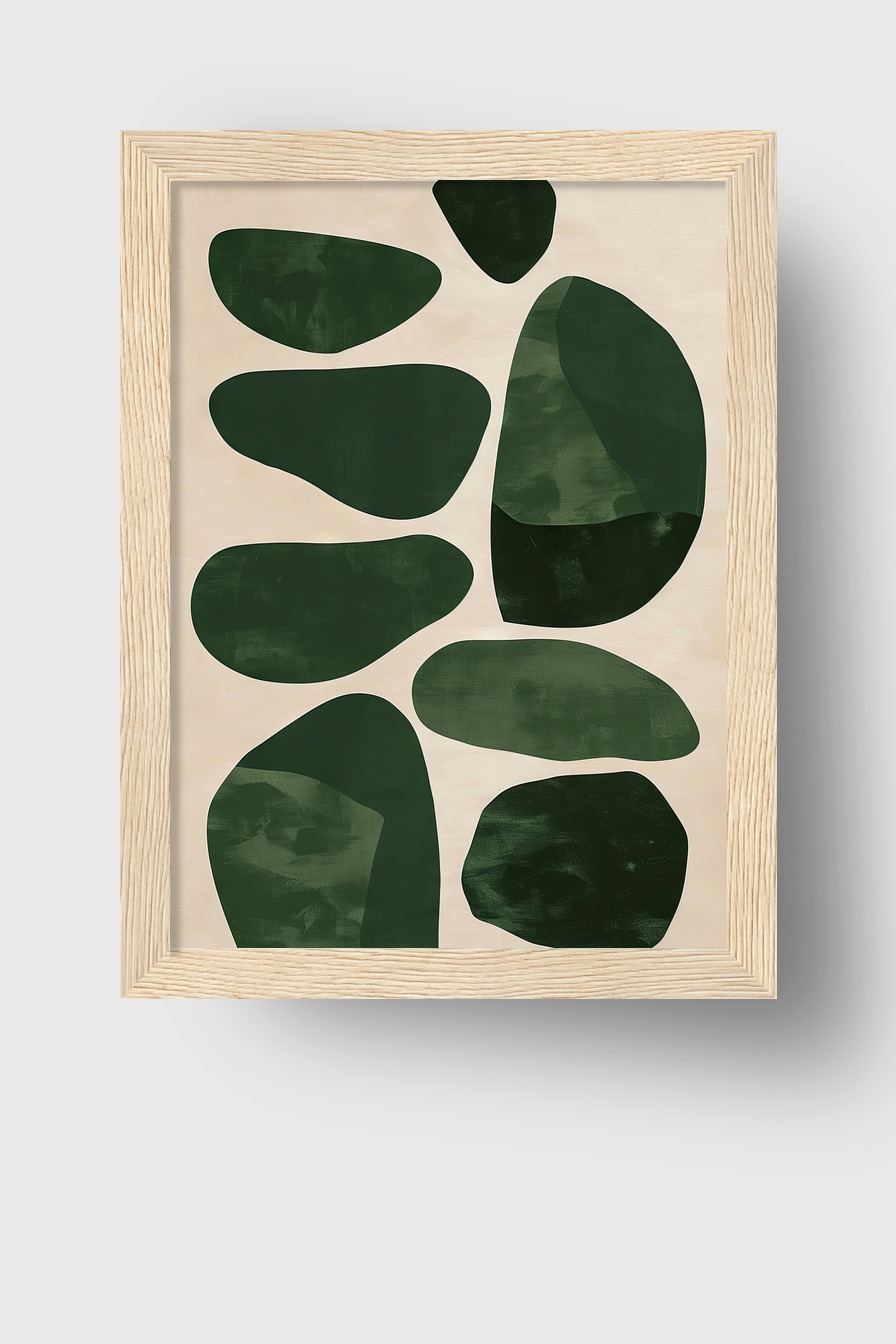 Dieses Motiv zeigt eine Anordnung großer dunkelgrüner organischer Formen auf einem hellen Beigeton. Das Design wirkt ruhig und modern durch seine schlichte Farbwahl und klare Formgebung.