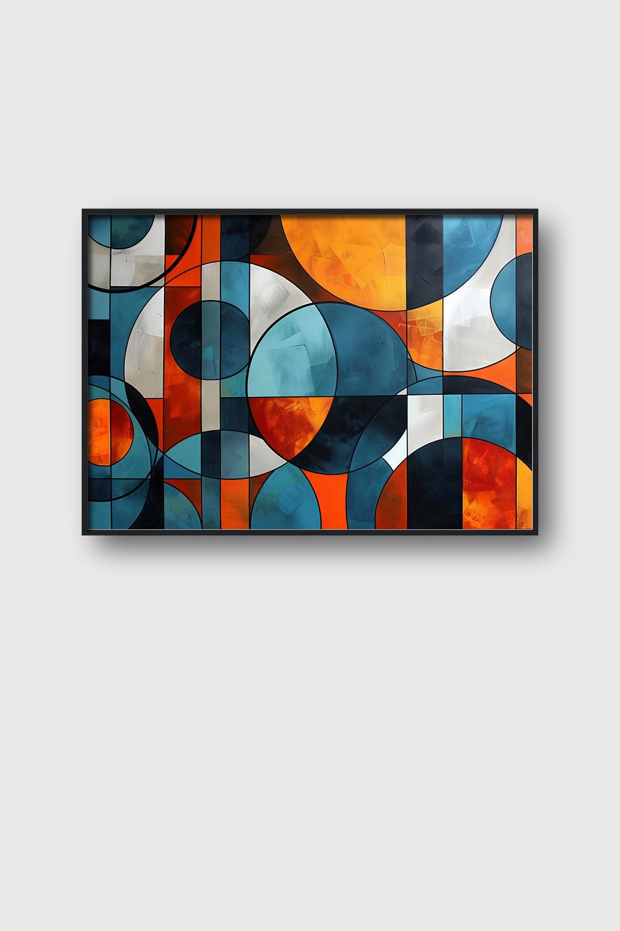 Dieses Motiv zeigt ein abstraktes Spiel aus Kreisen und Rechtecken in kräftigen Blau- und Orangetönen. Es eignet sich ideal für moderne Einrichtungen mit einem künstlerischen Akzent.