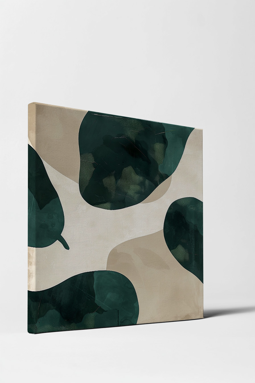 Das Motiv zeigt abstrakte grüne Blätter vor einem hellen, beigen Hintergrund. Die Formen wirken organisch und modern, ideal für zeitgenössische Wohnräume.