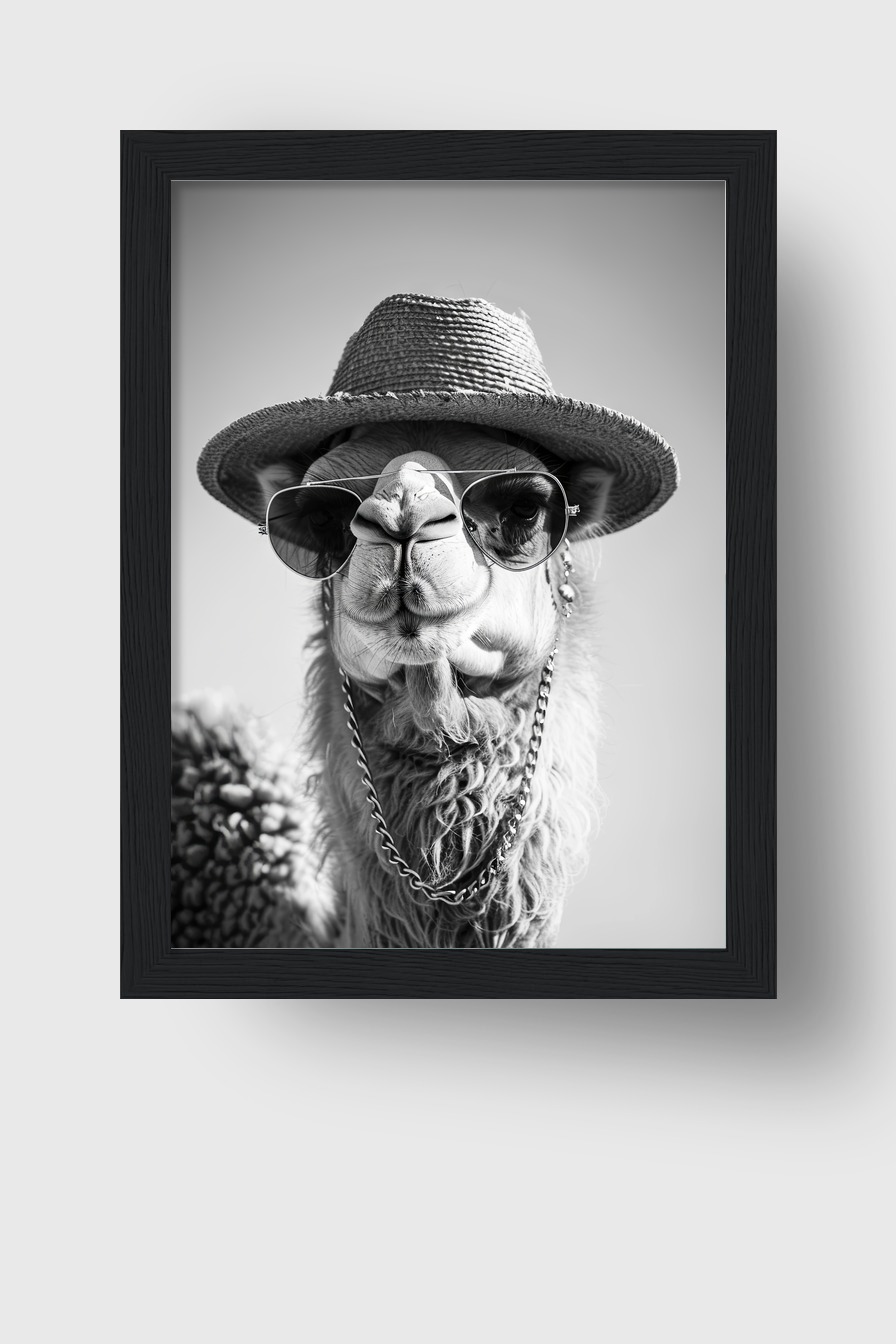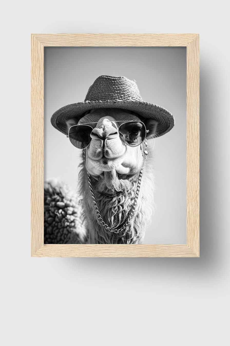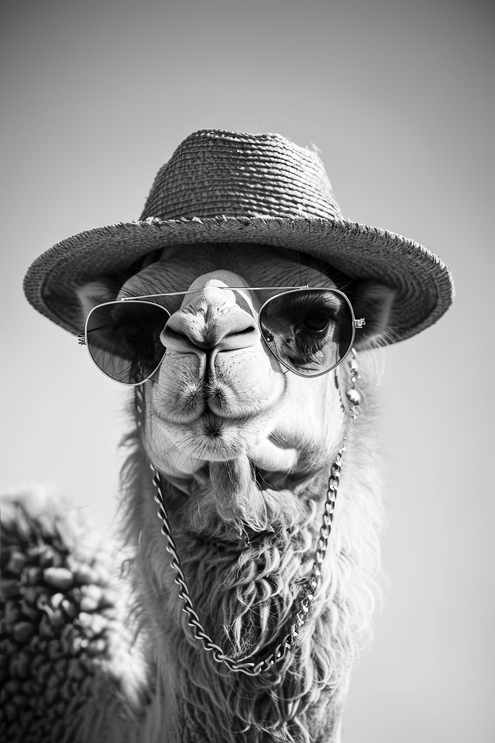 Das Bild zeigt ein Kamel mit Sonnenhut, Sonnenbrille und Kette im Schwarz-Weiß-Stil. Die Aufnahme betont den Ausdruck und Charakter des Tieres.