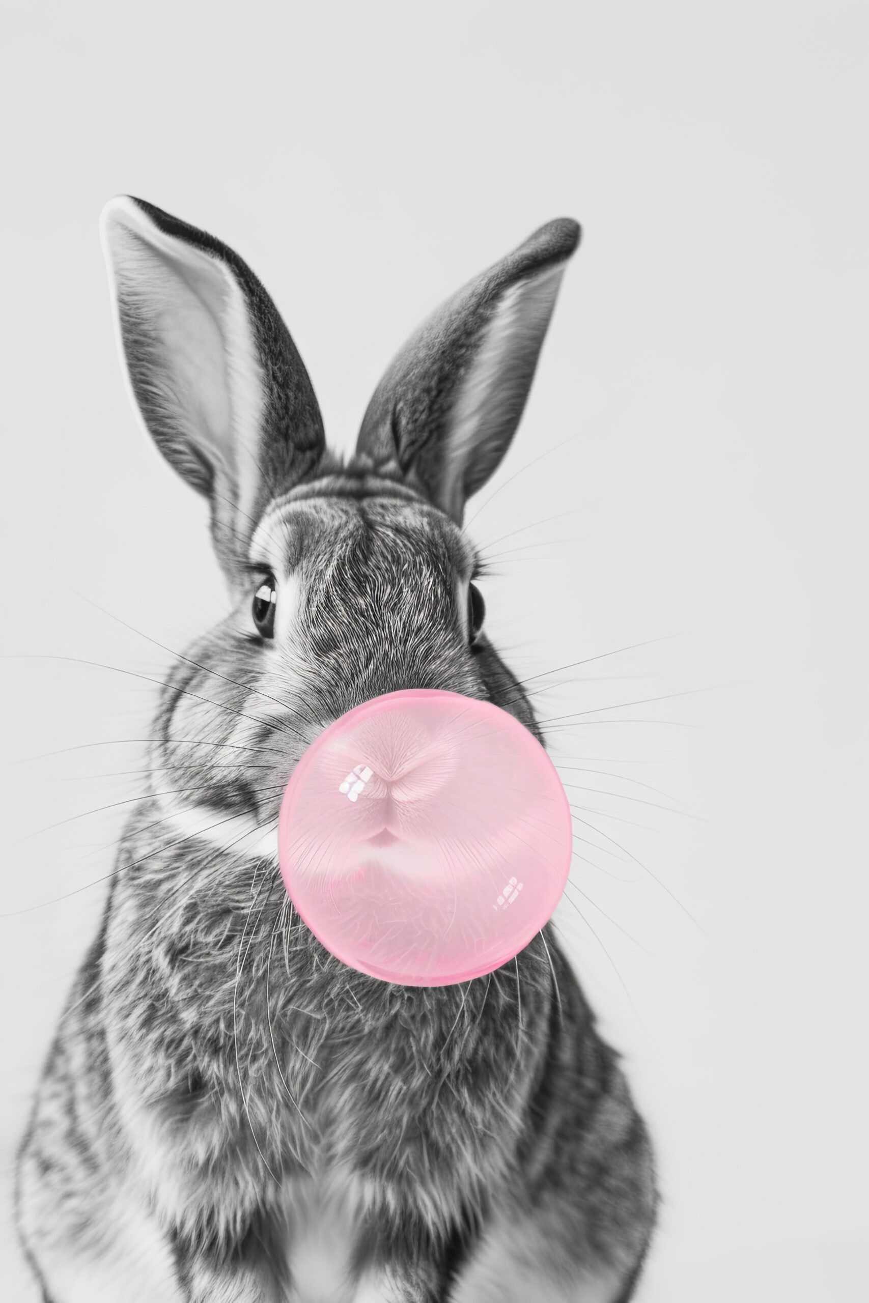 Das Bild zeigt ein Kaninchen, das eine große rosa Kaugummiblase bläst. Die Kombination aus Tier und knalliger Farbigkeit macht das Motiv besonders humorvoll.
