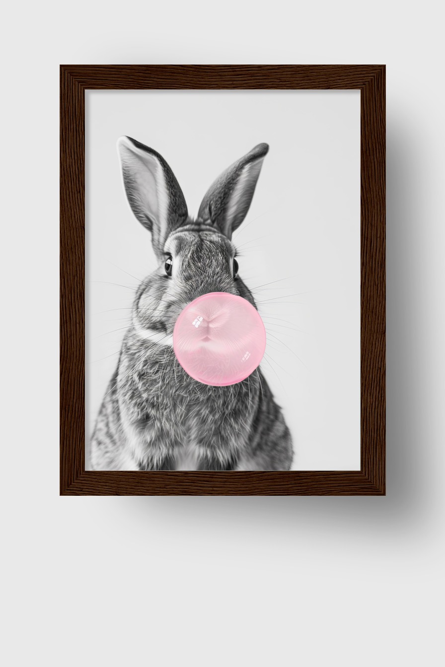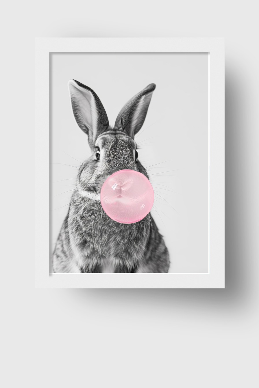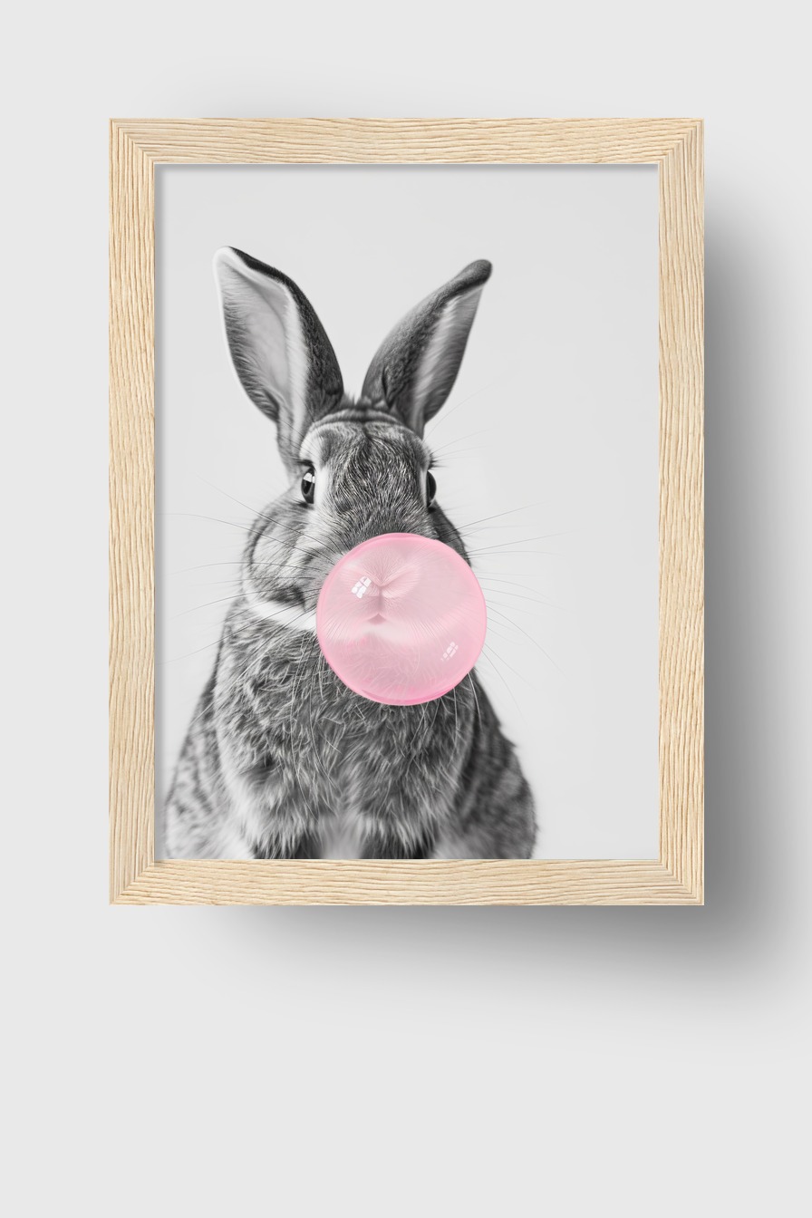 Poster eines Kaninchens mit rosa Kaugummiblase in Schwarz-Weiß mit farblicher Akzentuierung