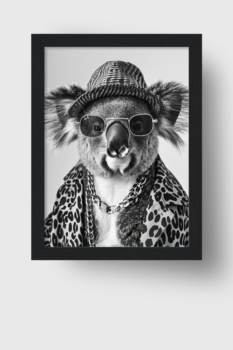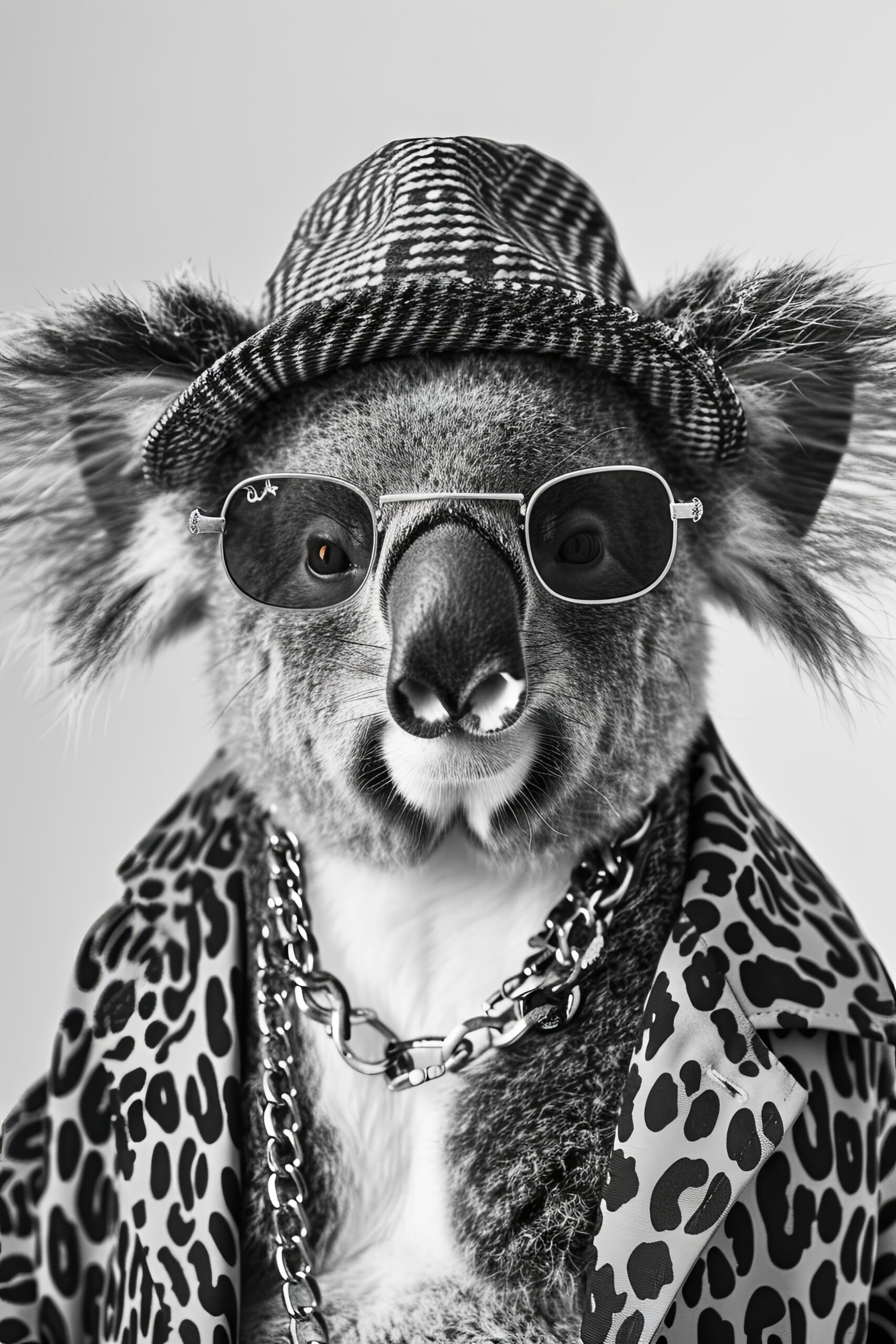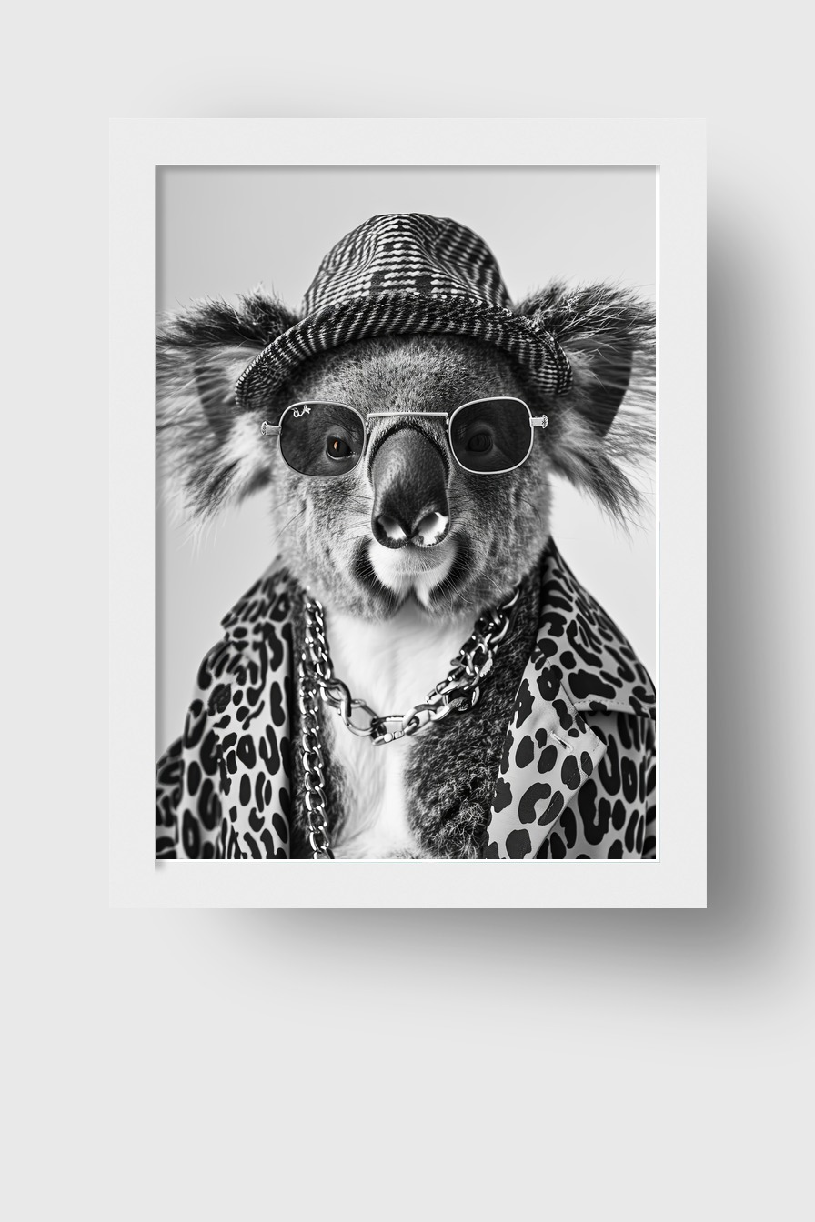 Ein Koala trägt eine Sonnenbrille, einen Hut und einen Leopardenmantel. Das schwarz-weiß Foto zeigt eine moderne und humorvolle Inszenierung des Tiers.