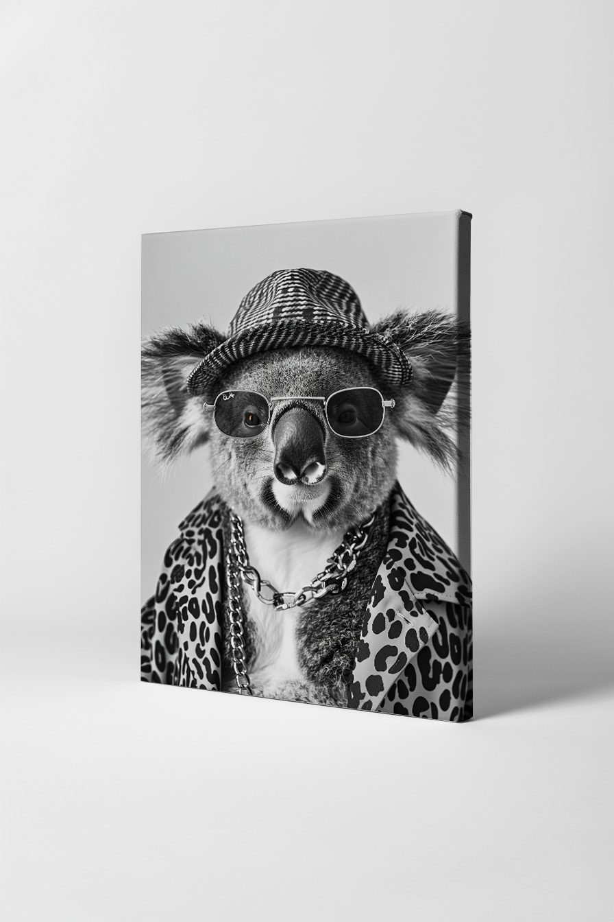 Ein Koala trägt eine Sonnenbrille, einen Hut und einen Leopardenmantel. Das schwarz-weiß Foto zeigt eine moderne und humorvolle Inszenierung des Tiers.