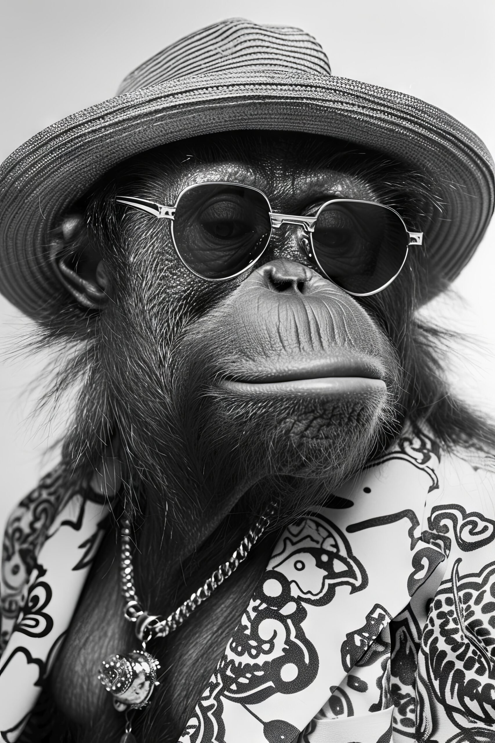 Das Bild zeigt einen Orang-Utan mit modischer Sonnenbrille und Hut. Die schwarz-weiße Aufnahme betont Kleidung und Accessoires.