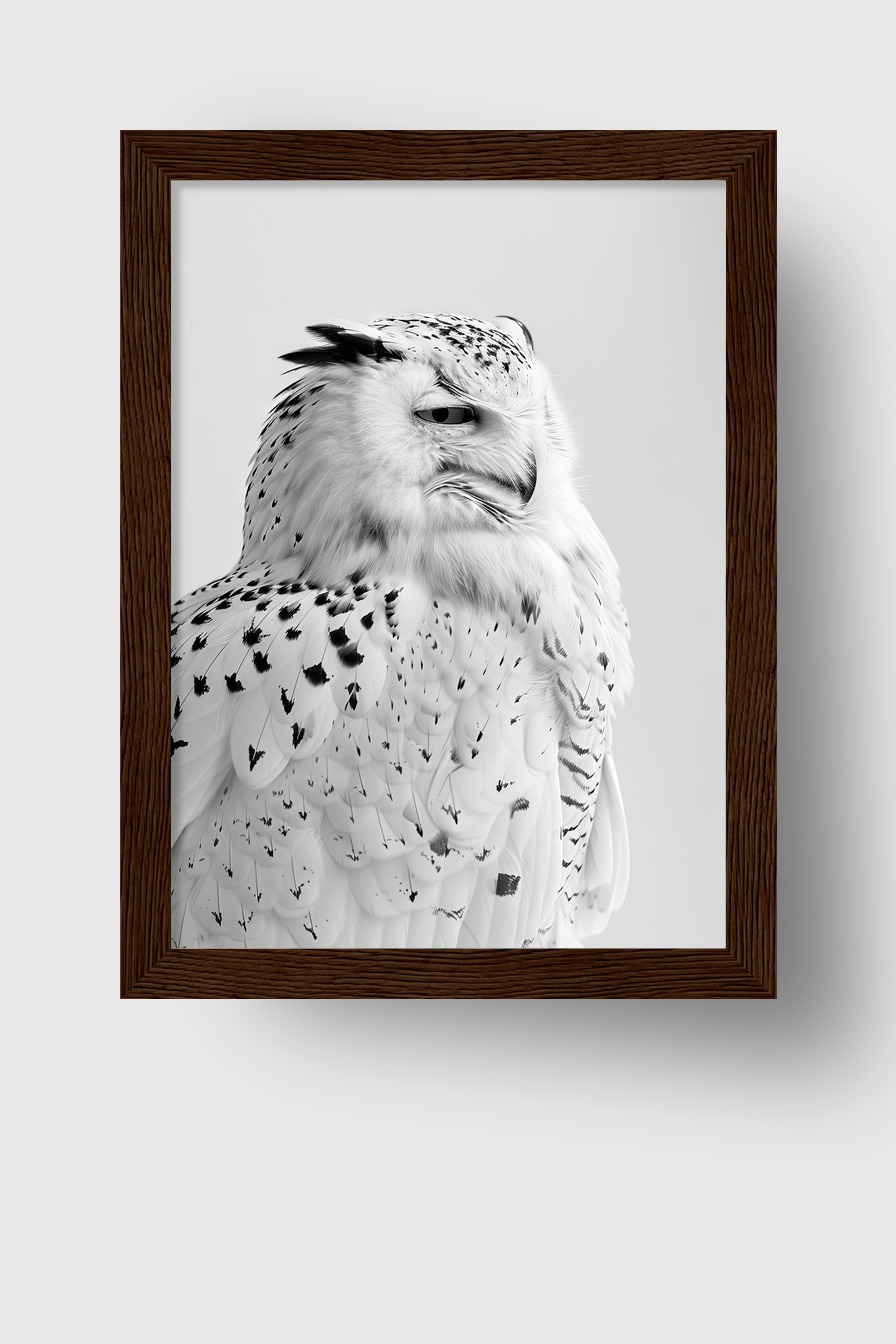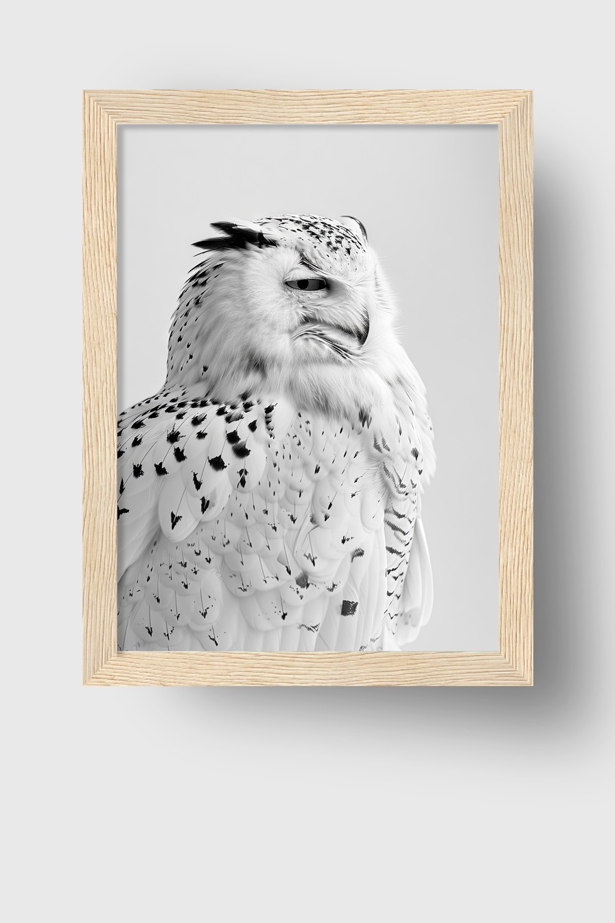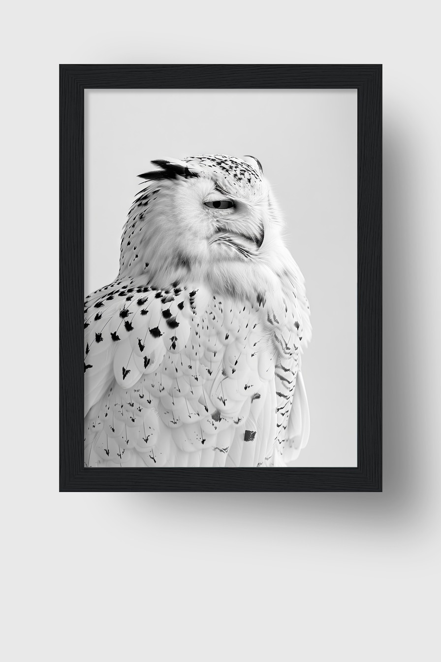 Poster einer Schnee-Eule Nahaufnahme in Schwarz-Weiß mit detailreichem Gefieder und natürlicher Eleganz
