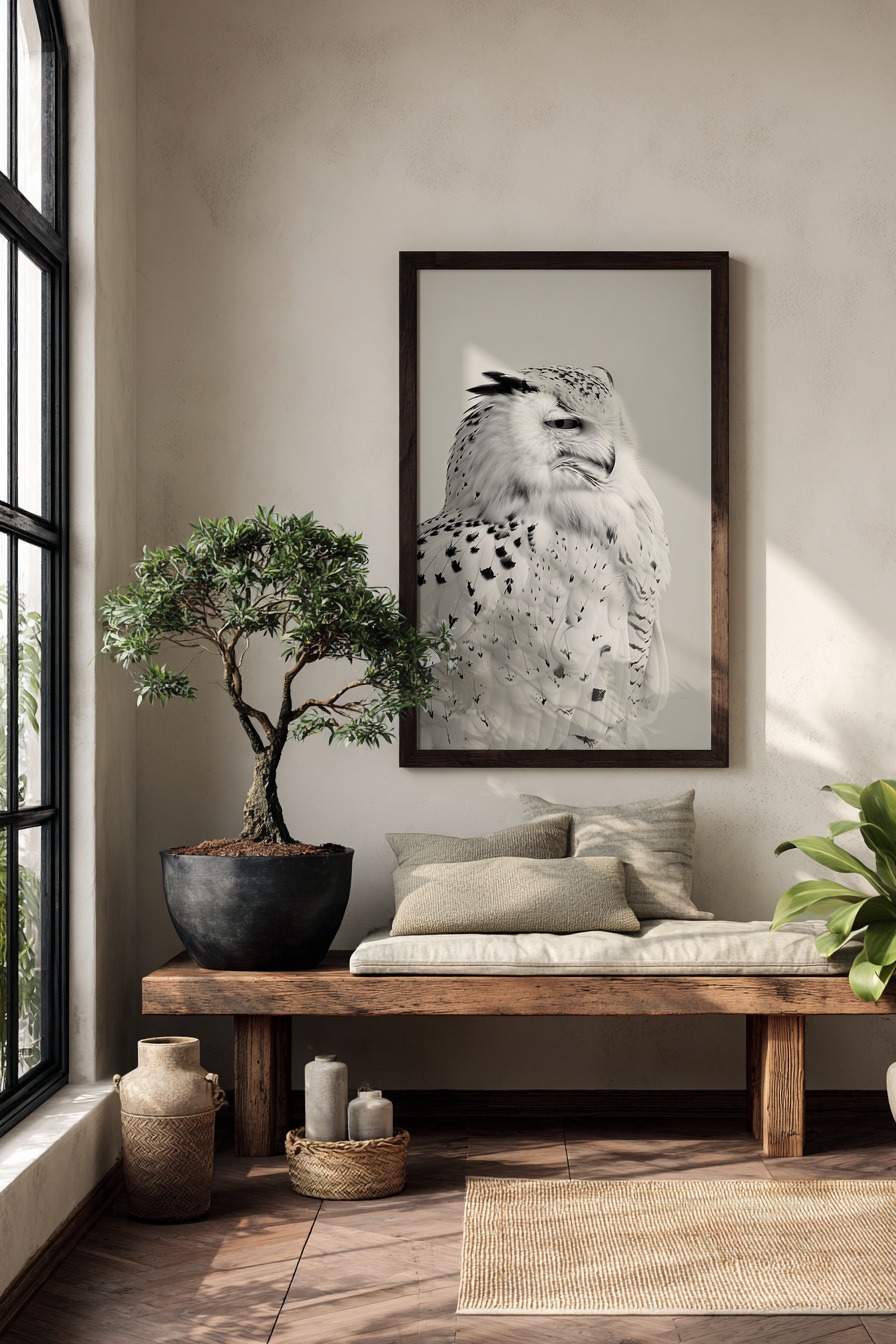 Natürliche Nahaufnahme einer Schnee-Eule mit detailreichem Gefieder. Die monochrome Darstellung hebt die feinen Strukturen der Federn hervor.