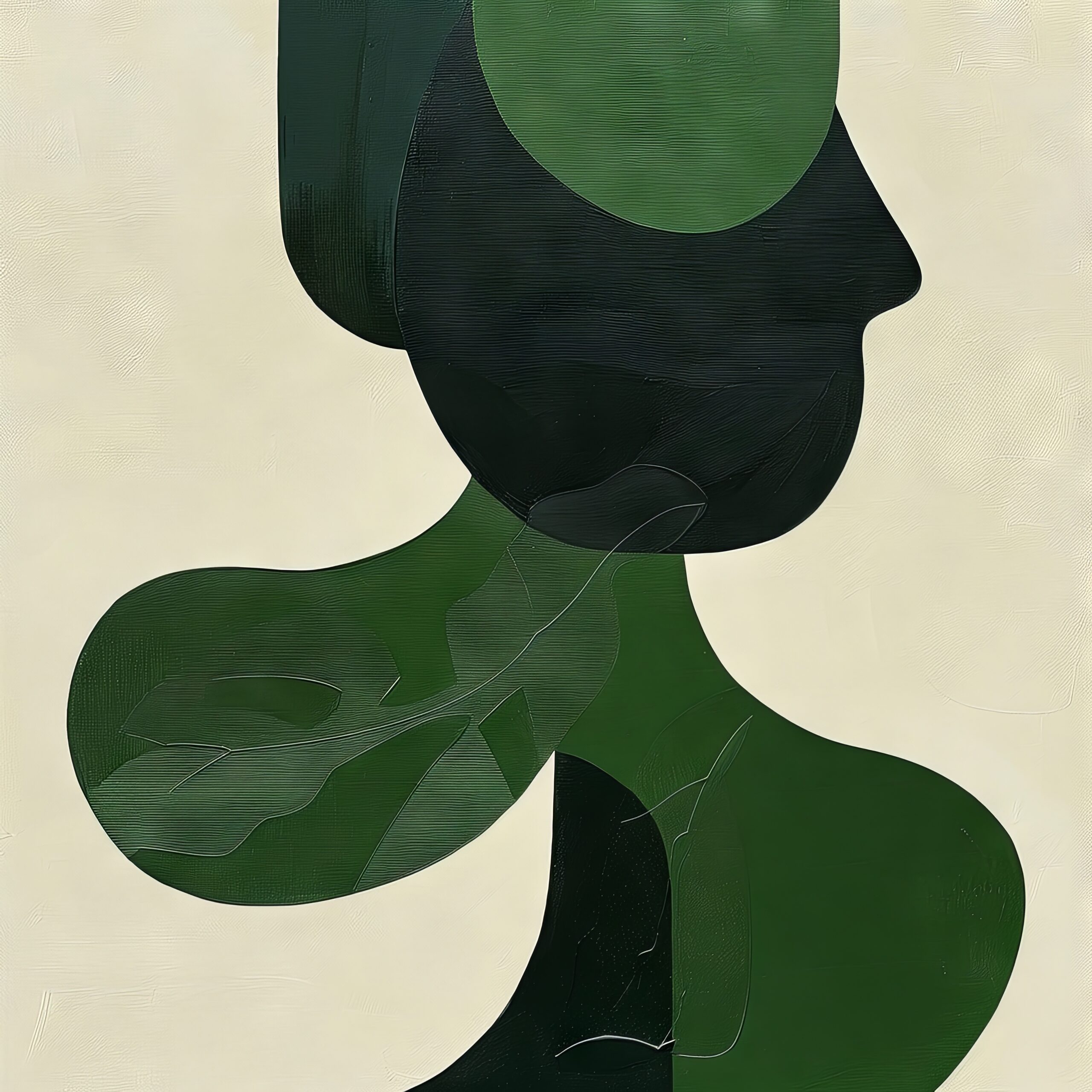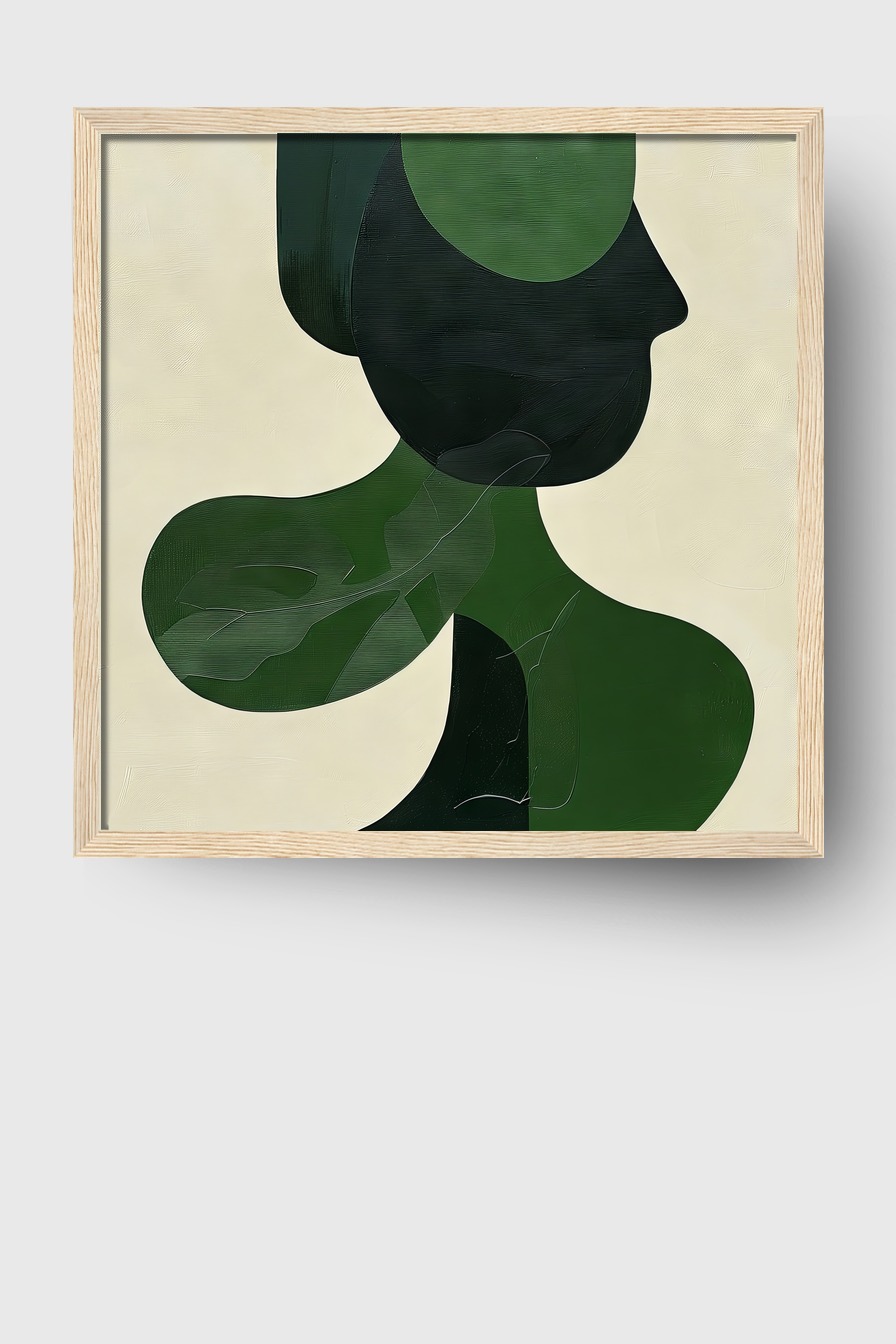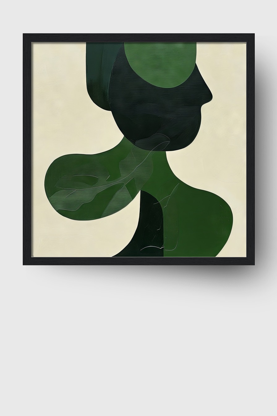 Diese abstrakte Darstellung zeigt eine menschliche Silhouette in grünen und schwarzen Farbtönen. Die fließenden Formen erzeugen eine harmonische und moderne Wirkung.